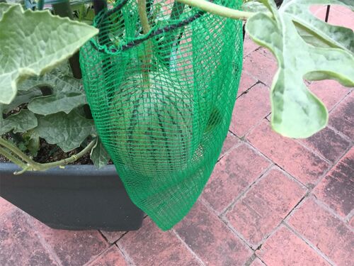 西瓜さん頑張っていますよ。アッ、落ちた!と、ならない様に網を被せて頑張っております。初挑戦で、このまま育ってくれるといいなあー西瓜🍉割り、な〜んて望みませが楽しみです。